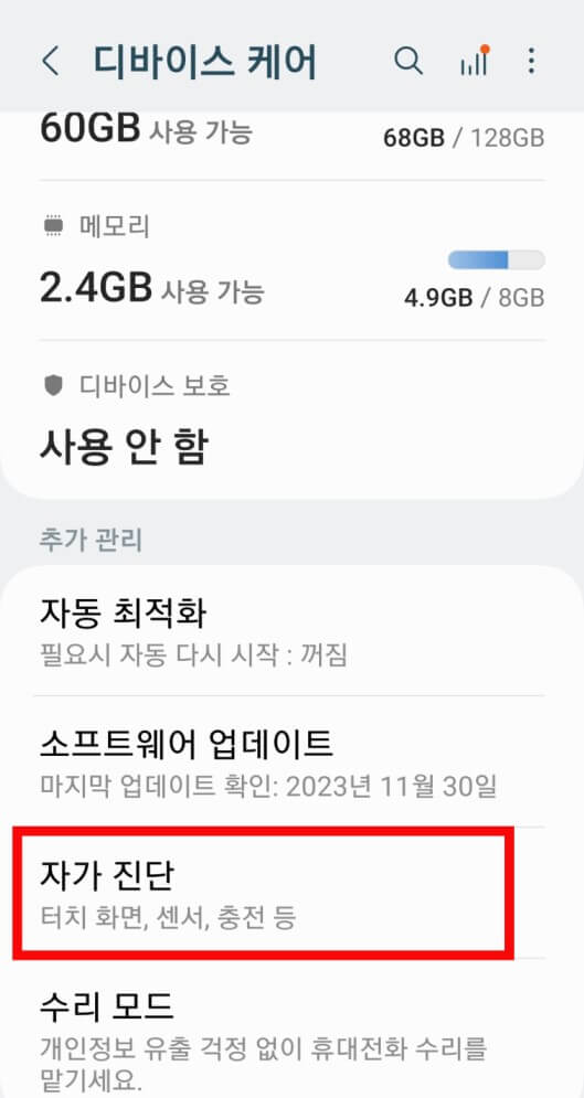 3. 디바이스 케어에서는 배터리 잔량과 메모리 등 본인의 휴대폰 상태를 확인하실 수 있는데요, 더 아래로 내리면 자가진단을 보실 수 있습니다.