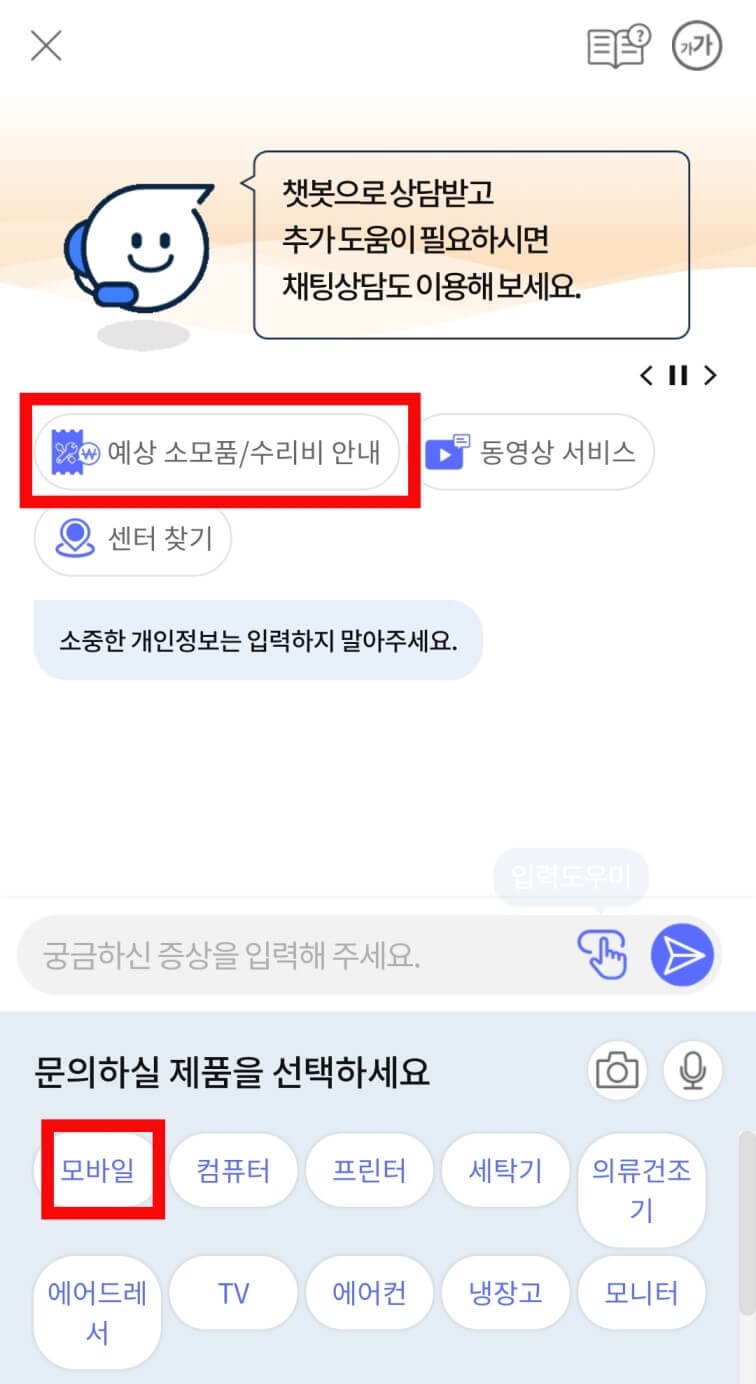 2. 상단에 바로 예상 소모품 / 수리비 안내, 혹은 하단의 모바일을 터치합니다.