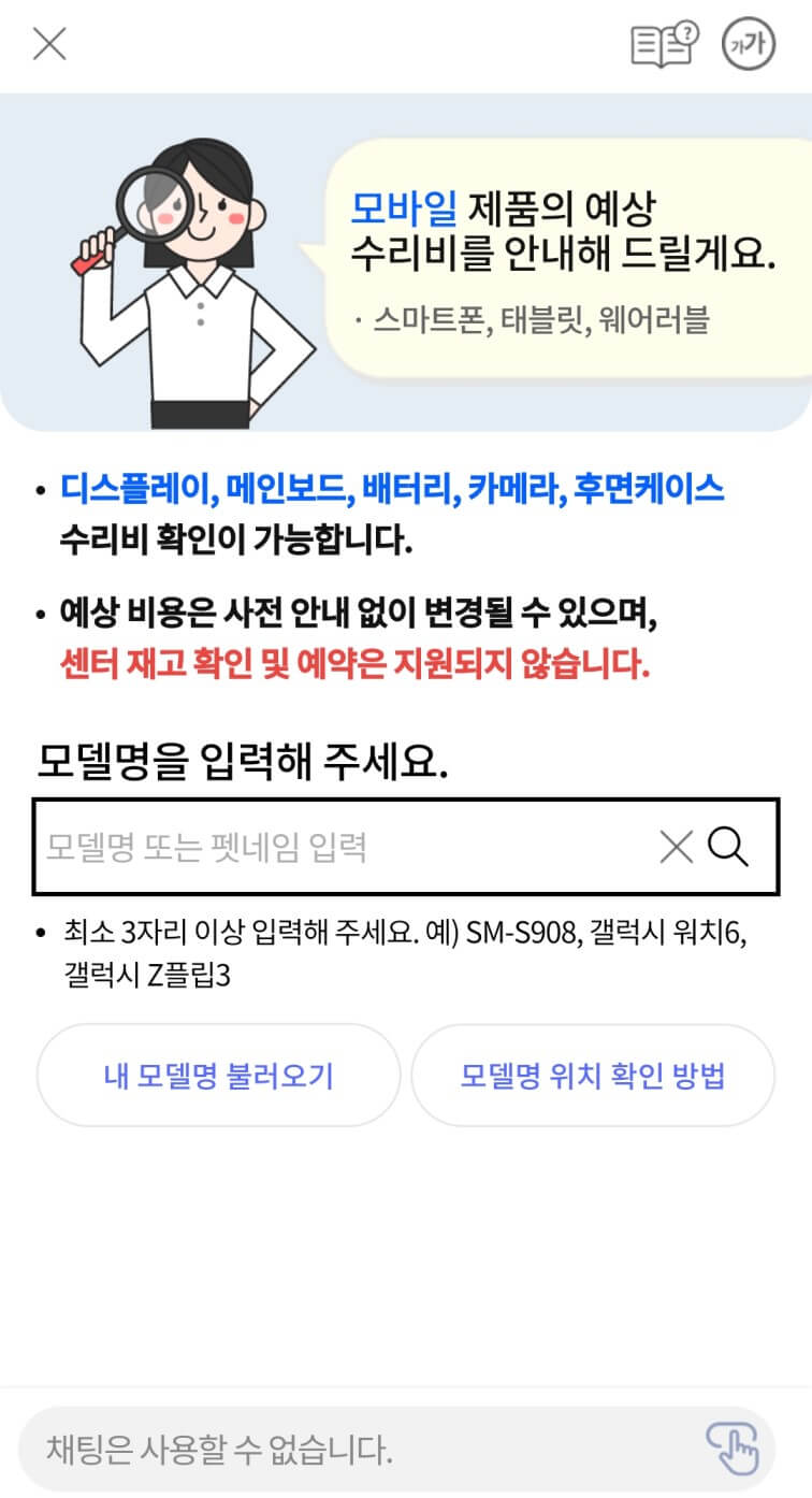 완충 후 휴대폰 사용 시간이 지나치게 짧아지거나, 사용 중 갑자기 꺼지는 등의 이상을 보이면 배터리 교체를 생각해봐야 합니다. 휴대폰 배터리 교체비용은 모델과 기종에 따라 다른데요, 우선 삼성 제품의 경우 챗봇을 이용해서 배터리 가격을 확인하실 수 있습니다. 저는 휴대폰에서 챗봇을 이용했습니다.