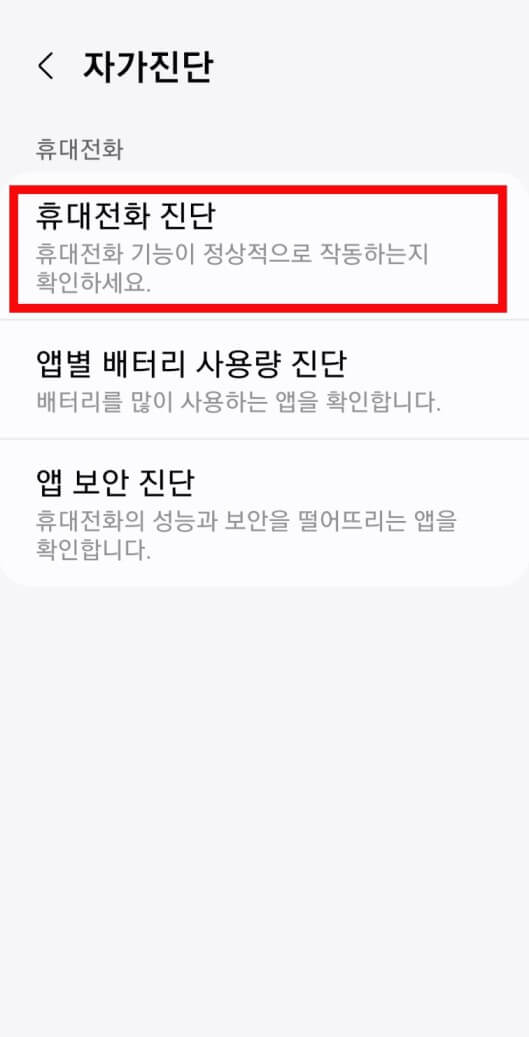 4. 자가진단을 터치하시고 맨 위에 있는 메뉴 휴대전화 진단을 터치하세요.