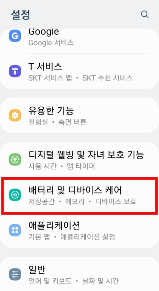 2. 관리페이지에서 중간 이하로 내려와 배터리 및 디바이스 케어를 터치합니다.