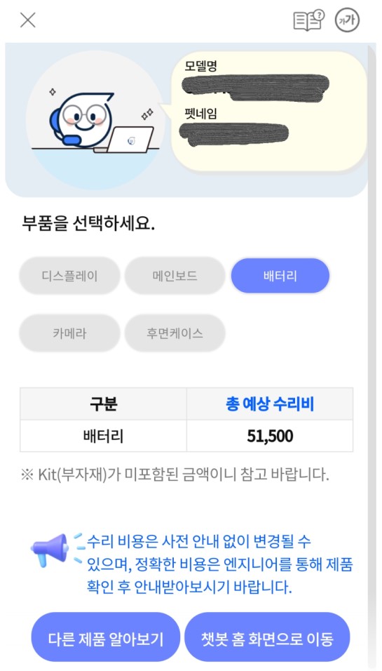 5. 부품을 선택하면 예상 수리비용이 나옵니다. 디스플레이(액정), 카메라, 메인보드, 배터리 등의 예상 수리비용을 확인할 수 있습니다. 새 제품에 비하면 상당히 저렴한 가격입니다.