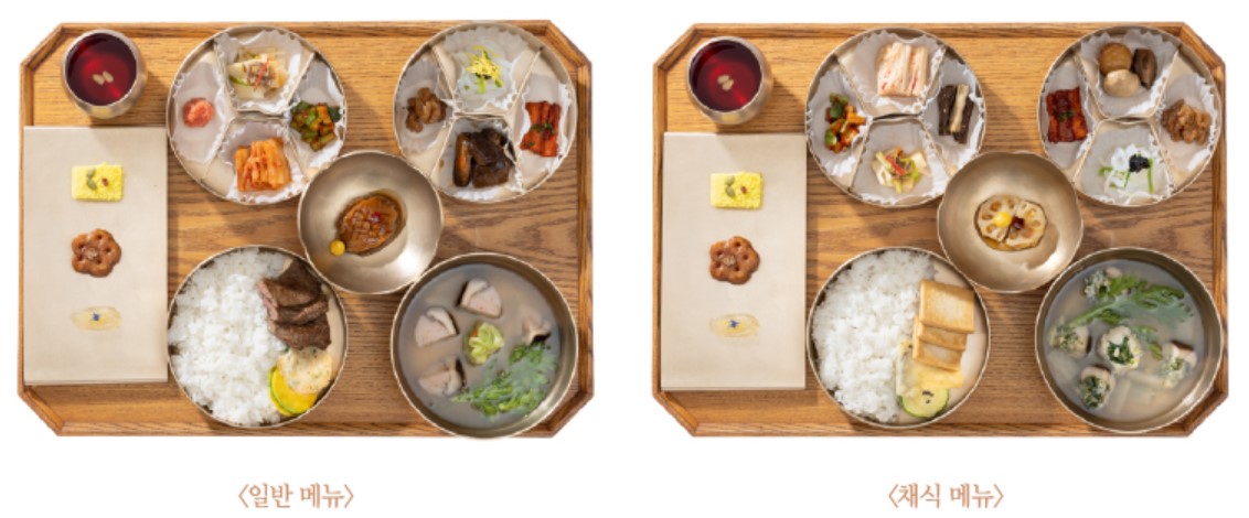 제공되는 음식은 전복초, 홍시죽순책, 더덕구이, 삼합장, 너비아니, 표고버섯탕 등 후식까지 더하면 12가지가 넘습니다. 혹시 채식을 희망하는 경우 행사당일 3일 전까지 사전신청하며 채식메뉴로 제공됩니다.
