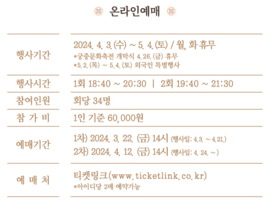 경복궁 별빛야행은 공연과 식사가 포함된 코스로 예매 시 공연장의 좌석번호를 참고하시고 예매하시기 바랍니다.