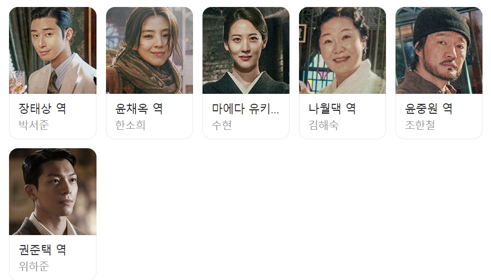 경성의 당시 모습을 잘 알 수는 없지만 화려하게 장식되어 있습니다. 특히 박서준 의상의 과한 어깨와 큰 깃, 현대적인 감각의 옷차림은 장태상이라는 인물을 더 부각하기 위함이었겠지만 현대물이라고 봐도 무방할 정도로 모던했습니다. 그래서 드라마 보는 재미가 더 생기기도 했지요.