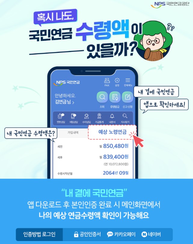 국민연금공단 홈페이지에서 신청하실 경우에는 공동인증서 혹은 금융인증서나 네이버 인증 등을 통해 로그인 후에 이용하실 수 있습니다.