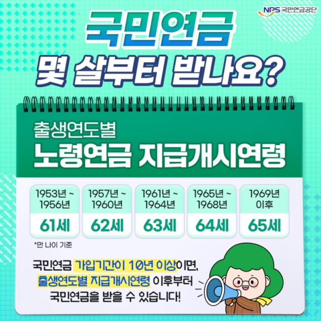 국민연금은 노령연금으로도 불리는데요 같은 뜻입니다. 국민연금은 가입기간(납입기간)이 10년 이상이고, 출생 연도별 지급개시 연령이 되면 받을 수 있습니다. 즉, 국민연금을 10년 이상 납부했어도 출생연도가 다르면 지급 개시 연령도 다릅니다. 실제로 1953년생은 61세부터 수령했지만, 1969년생은 65세부터 받으실 수 있습니다. (*만 나이 기준)