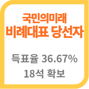 국민의미래는 총 36명의 비례대표 후보를 냈었습니다. 총선 결과 36.67%의 득표율로 총 18석을 확보해 1번 최보윤 후보부터 18번 박준태 후보까지 당선되었습니다.