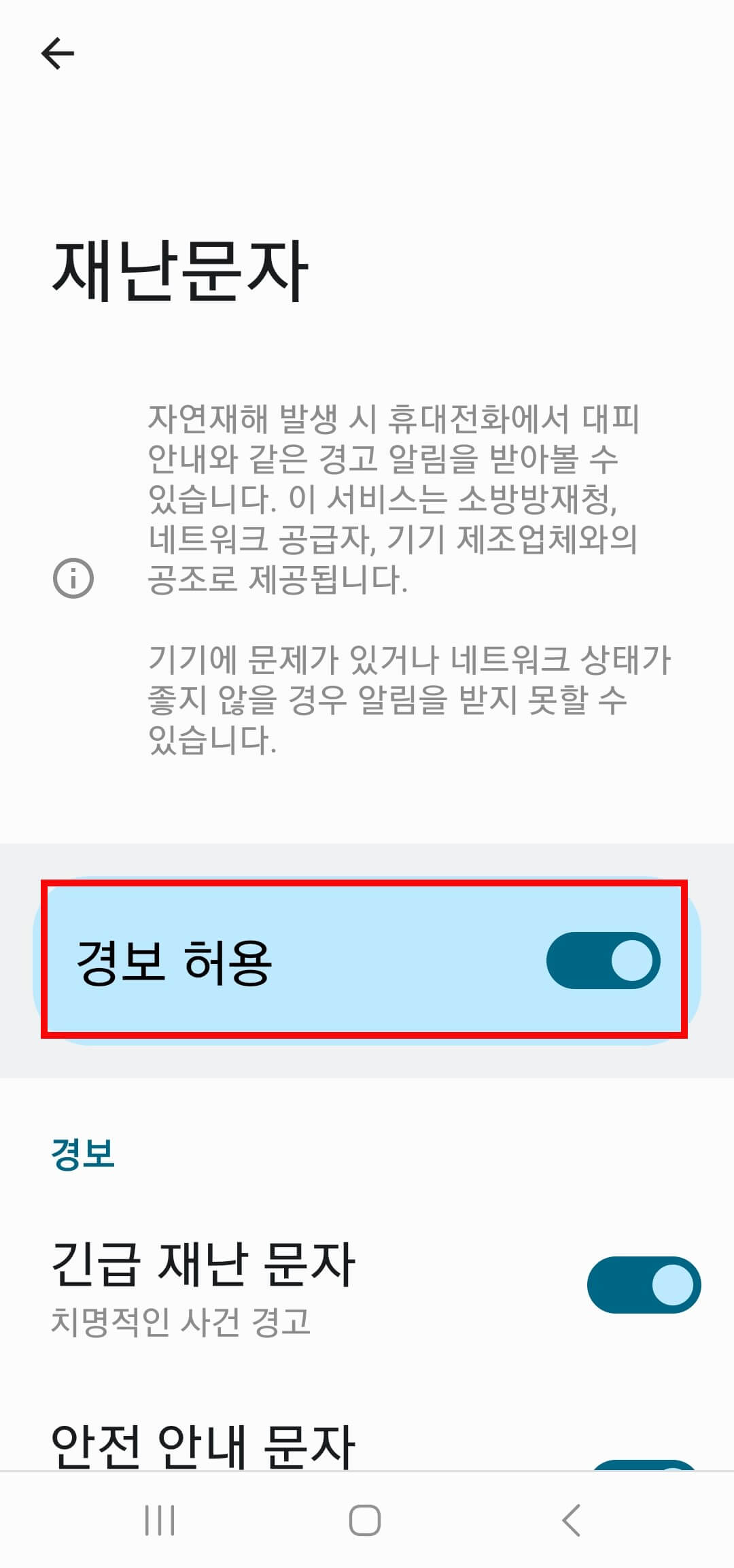 5. 재난문자에서 경보허용을 비활성화 상태(회색)로 하면 더 이상 재난문자를 받지 않게 됩니다.