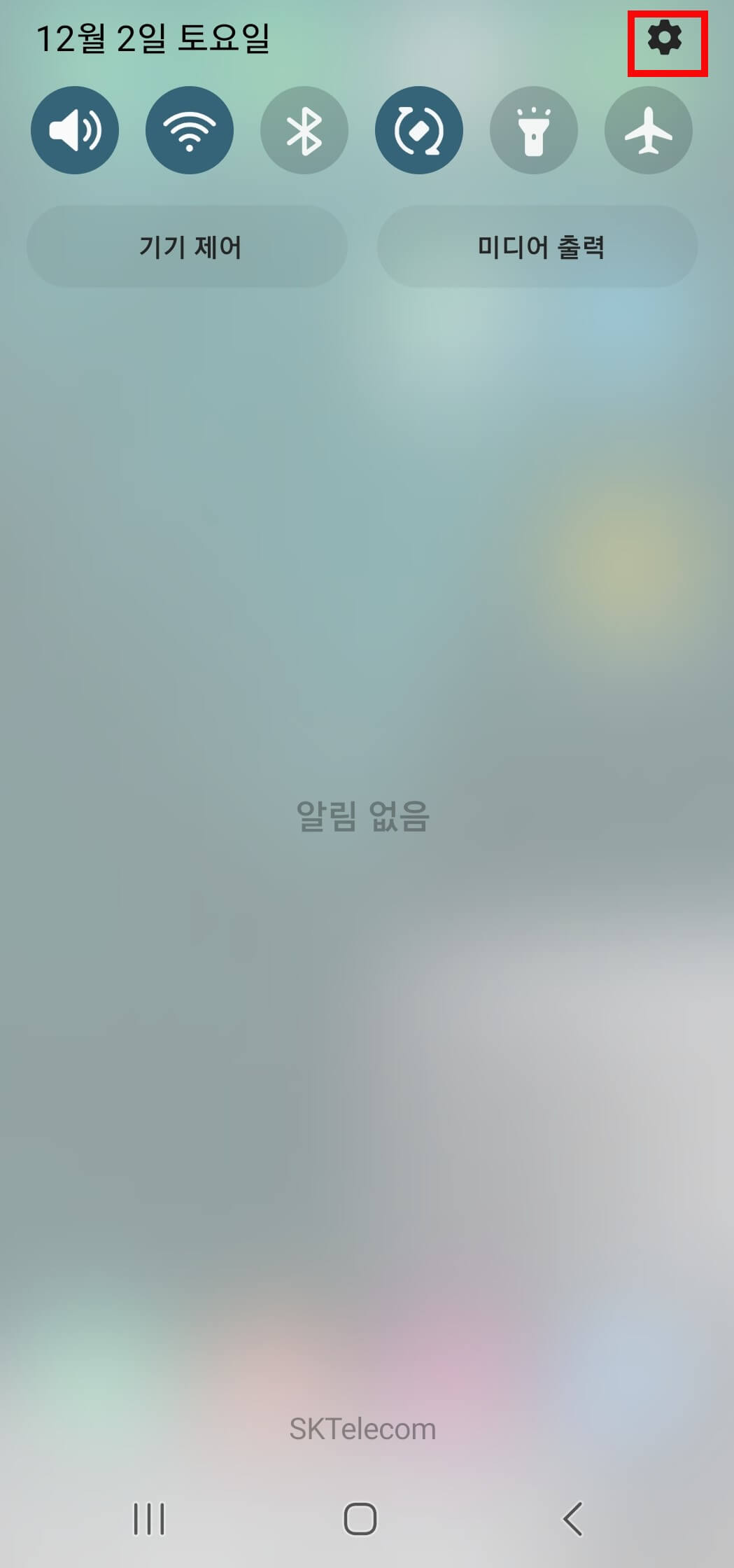 휴대폰 기종마다 설정 방법이 다르겠지만 삼성 갤럭시폰은 어플로 들어가서 설정을 찾습니다. 혹은 휴대폰 화면 상단(시간, 휴대폰 배터리 잔량표시 등이 있는 곳)을 아래로 쓸어내리면 톱니바퀴 모양을 볼 수 있습니다.