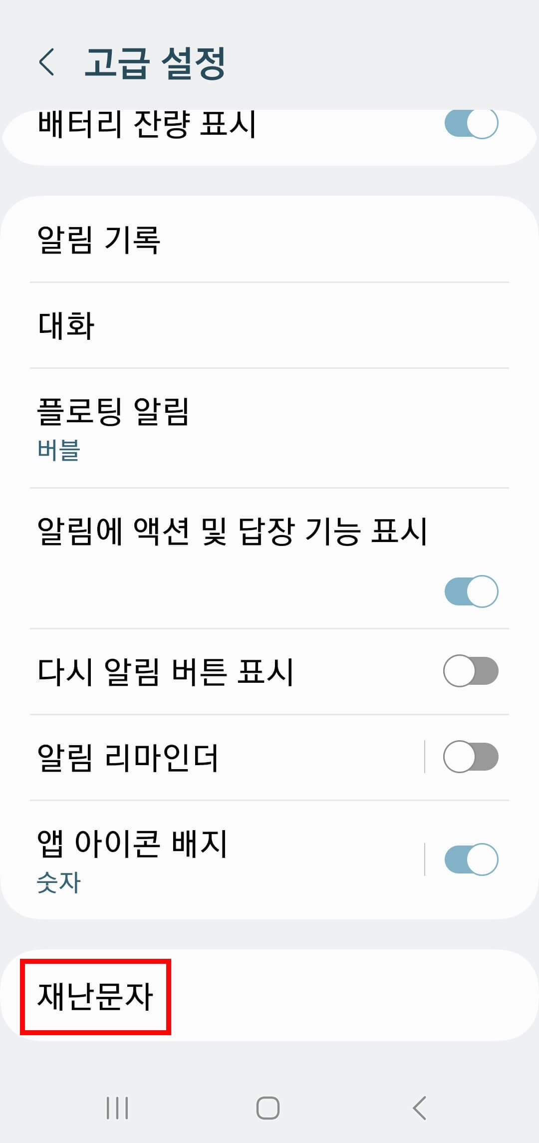 4. 고급설정의 아랫부분에 재난문자를 클릭합니다.