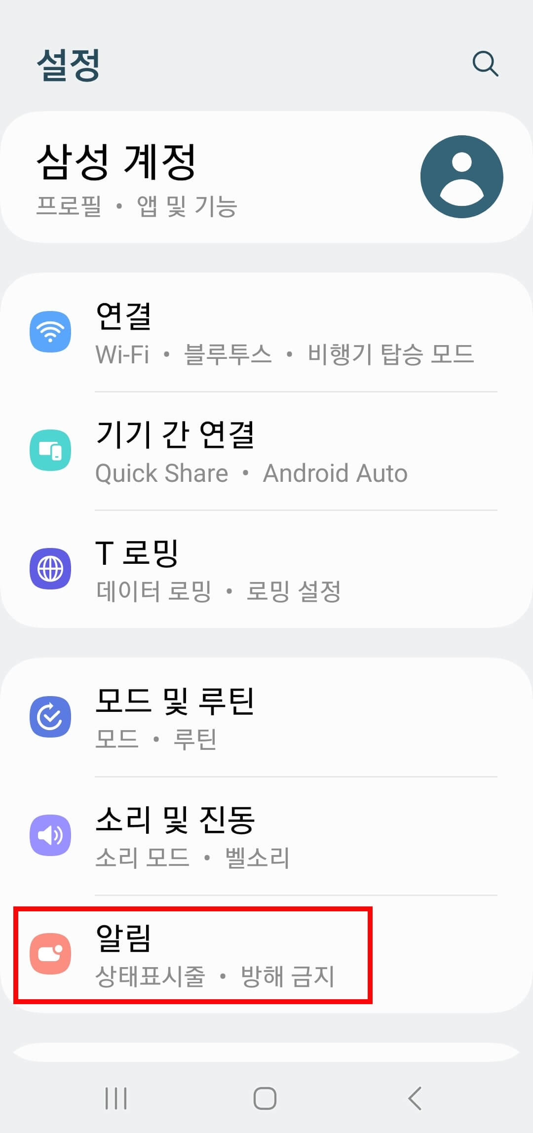 2. 설정의 아랫부분에 알림을 클릭합니다.