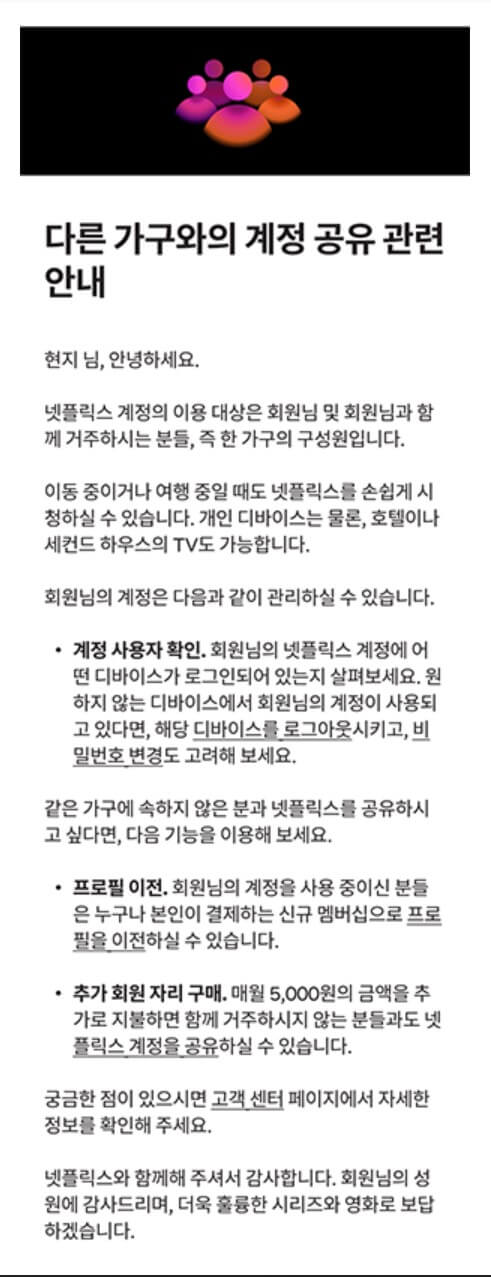넷플릭스의 계정공유 금지 정책은 관련 내용을 회원들에게 이메일을 전송하며 점진적으로 시행하고 있습니다. 회원과 같은 가구에 살고 있지 않은 이용자는 계정 접근 시 안내 메시지가 표시됩니다.