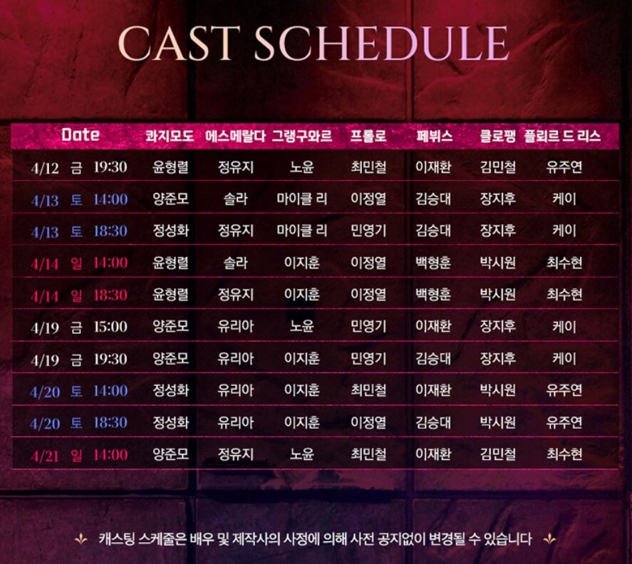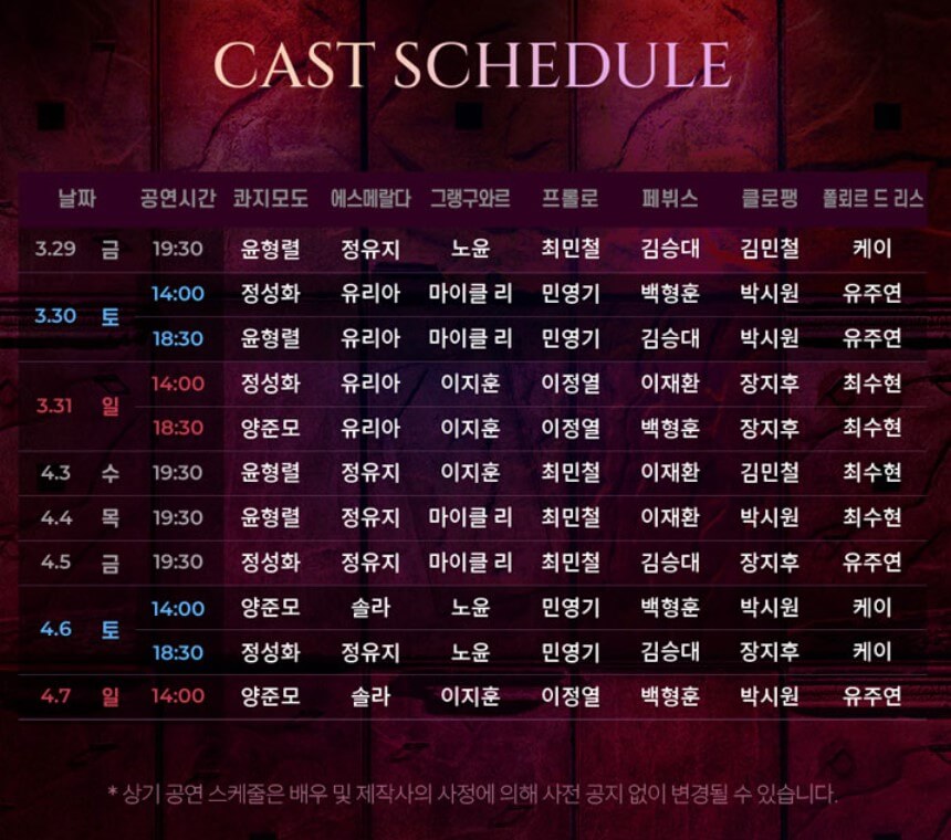 좋아하는 배우가 있다면 출연하는 날을 확인하셔서 예매하시기 바랍니다. 캐스팅 스케줄은 글 하단에 있습니다.