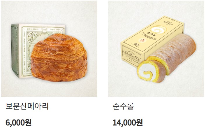 보문산의 메아리도 담백한 페스츄리로 선물용으로 좋습니다. 역시 박스 판매됩니다. 성심당의 독특한 메뉴로 명란의 짭짤한 맛을 함께 느낄 수 있는 명란바게트와 커피와 잘 어울리는 앙버터가 있습니다.
