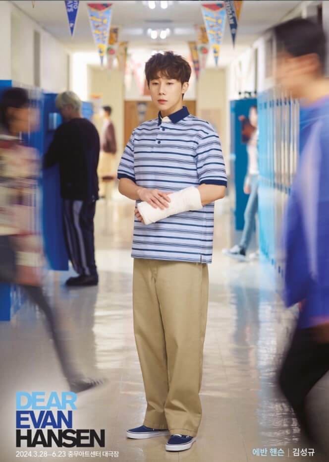 2017년 토니상 최다 부문 노미네이트, 최우수 뮤지컬상을 받은 디어 에반 핸슨이 한국에 진출했습니다. 어떤 배우가 출연할지 많이 궁금하실 텐데요, 주인공 에반 핸슨역에 인피니트 출신의 김성규, 박강현, 임규형이 출연합니다.