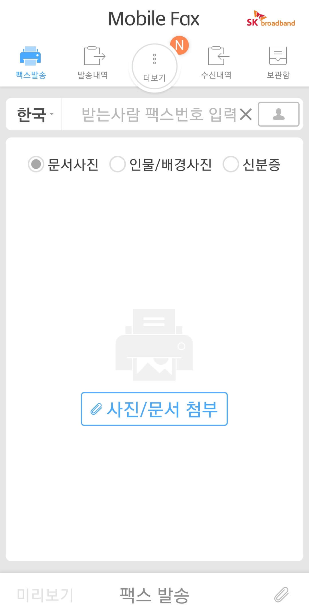 상단 메뉴 팩스 발송을 선택하면 팩스를 보낼 수 있습니다. 발송할 문서를 사진 촬영한 뒤 첨부하고, 받는 사람 팩스 번호를 상단에 입력합니다.