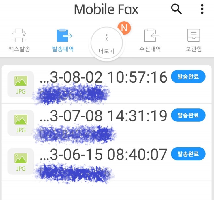 발송 내역에서는 지금까지 보낸 내역을, 수신 내역에서는 받은 팩스를 확인해 볼 수 있습니다. 팩스가 수신되면 휴대폰에 팩스를 수신했다는 알림이 뜨게 됩니다.