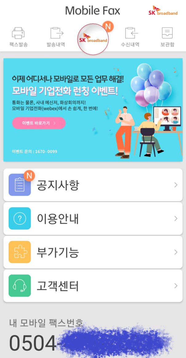 팩스번호는 0504로 시작하는 조금 낯선 번호인데요, 외우지 않아도 됩니다. 내 모바일 팩스 번호는 어플 메인 화면 더 보기를 터치하시면 하단에서 확인할 수 있습니다.