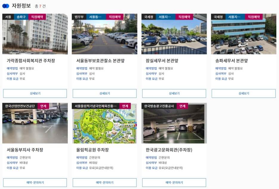 이용할 수 있는 주차장이 검색되고 예약 필요여부, 유무료 등이 표시됩니다. 필요한 지역의 주차장을 클릭하시면 자세한 주소와 이용시간, 정원 등을 파악할 수 있습니다. 아쉬운 것은 여유 주차공간이 있는지를 알 수 없다는 점입니다. 그래도 몇 곳 찾아놓으면 주차장 찾아 헤매지 않아 편리하게 이용할 수 있습니다.