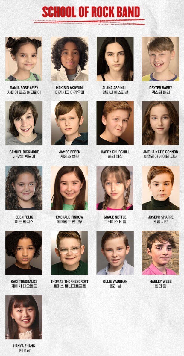 뮤지컬 스쿨 오브 락 서울 공연은 월드투어로 브로드웨이, 웨스트엔드 출연진과 전 세계에서 찾아낸 천재적인 어린 배우들의 완벽한 무대를 경험하실 수 있습니다. 오리지널 무대를 빛내줄 출연진들을 소개합니다.