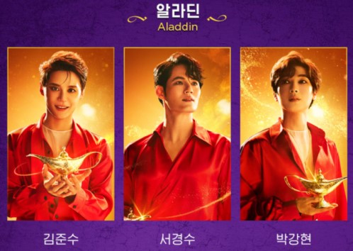 장장 6개월이 넘는 기간 동안 공연이 이어지게 될 알라딘은 주인공 알라딘 역에 김준수, 서경수, 박강현이 출연합니다. 매력적인 램프의 요정 지니에는 정성화, 정원영, 강홍석, 자스민 역에는 이성경, 민경아, 최지혜가 열연합니다.