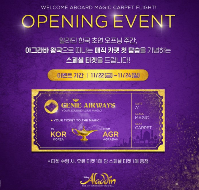 알라딘 한국 초연을 기념해서 오프닝 주간에는 아그라바 왕국으로 떠나는 매직 카펫 탑승을 기념하는 스페셜 티켓을 증정합니다. 티켓 수령 시 유료 티켓 1매당 스페셜 티켓 1매를 증정합니다.
