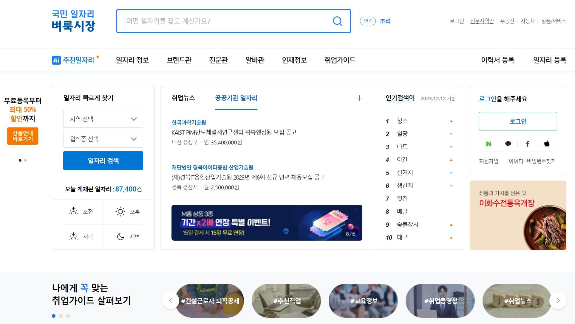 인터넷 검색창에 벼룩시장을 치면 사이트를 바로 검색할 수 있습니다. 홈페이지 첫 화면 국민일자리 벼룩시장에서 원하는 일자리 정보를 검색할 수 있습니다. 로그인하지 않아도 이용할 수 있고, 원한다면 네이버나 카카오, 애플 등의 계정을 이용해 로그인할 수 있습니다.