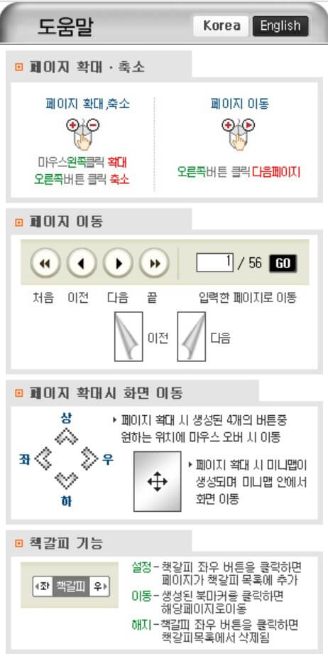 이용방법은 간단하지만 헷갈리신다면 상단 오른쪽 네모 안에 '도움말'이라고 적힌 것을 클릭하시면 사용방법이 나옵니다. 페이지 이동, 확대방법, 책갈피 기능 등을 확인할 수 있습니다.