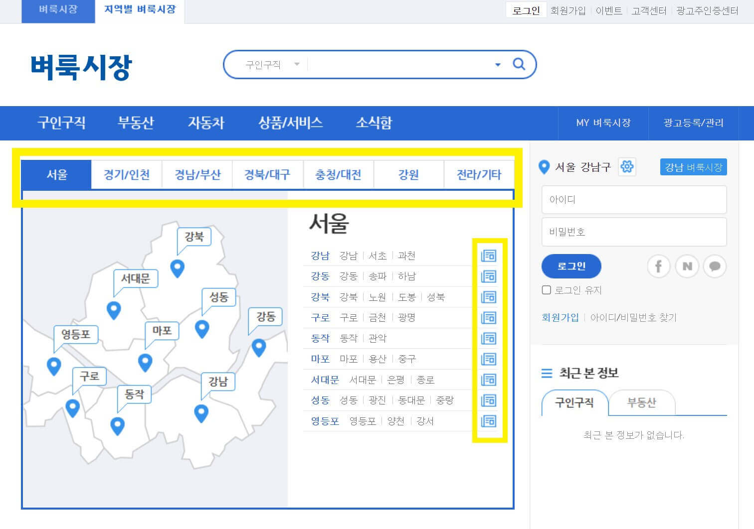 사실, 벼룩시장은 지역별로 따로 구분되어 있습니다. 오른쪽 상단의 신문지역판을 클릭하시면 됩니다. 지역별로 출판되는 벼룩시장 신문을 그대로 볼 수 있는 페이지로, 세부 지역명 옆의 신문 모양 아이콘을 클릭하면 신문 그대로 보기가 가능합니다.