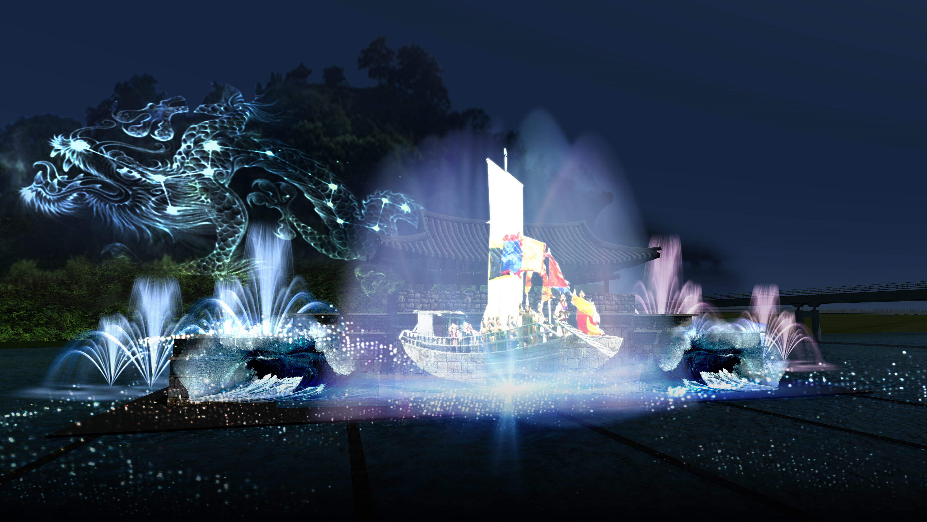 대백제의 대표 프로그램으로 특별한 볼거인 수상 멀티미디어 쇼를 소개합니다. 웅진 시기 백제의 중흥을 위해 노력한 '무령왕'과 공주의 '계산'에 대한 이야기를 바탕으로 영상과 음향, 조명, 특수효과, 레이저를 이용해 수상쇼를 연출합니다. 축제 기간 중 공주 금강신관공원 미르섬과 백제 문화단지에서 펼쳐집니다.