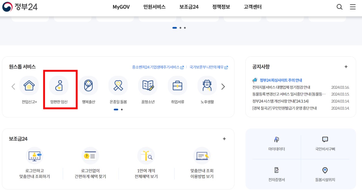 엽산, 철분제, 임신출산진료비 지원 등 타 서비스와 동시 신청 가능합니다. 출산 후에는 정부 24 홈페이지 신청이 불가합니다.