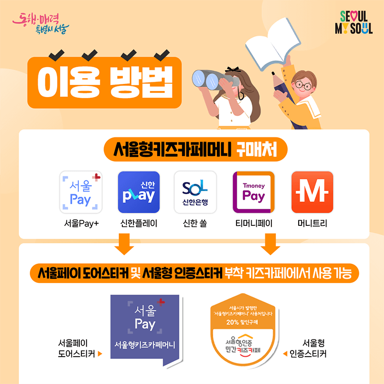 서울형키즈카페머니는 앱을 통해 상품권을 구입한 후 서울페이 도어스티커 및 서울형 인증스티커가 부착된 키즈카페에서 사용하면 됩니다.