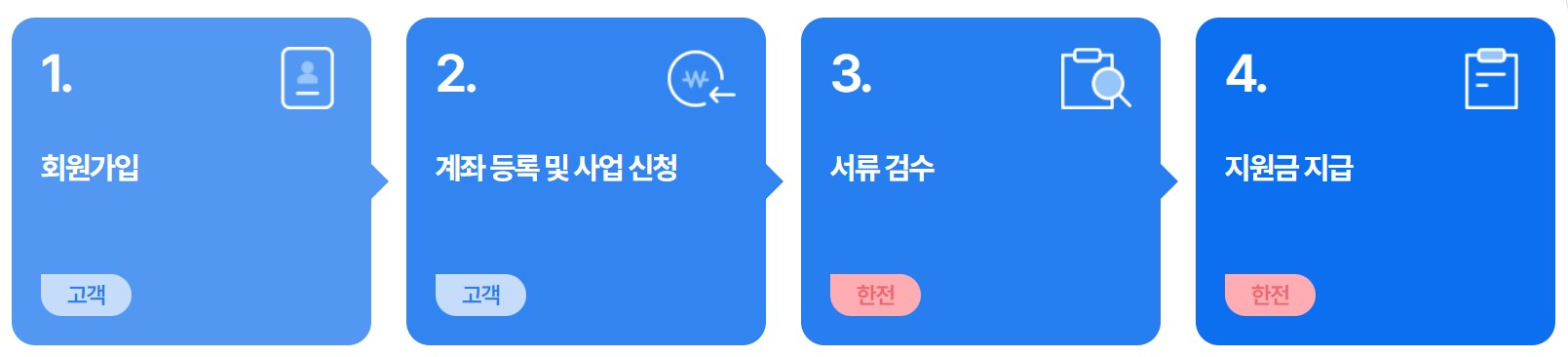 회원 가입 후 구비서류를 제출하시고 계좌 등록 및 사업 신청하시면 서류 검수를 거쳐 지원금을 받으시게 됩니다.