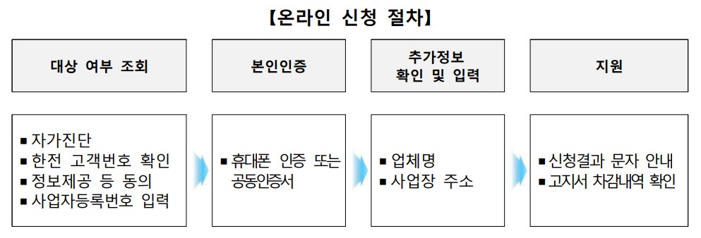 온라인 신청 시 자가진단, 한전 고객번호, 사업자등록 번호 등을 입력한 후 휴대폰 혹은 인증서를 통한 본인 인증 절차가 있습니다.