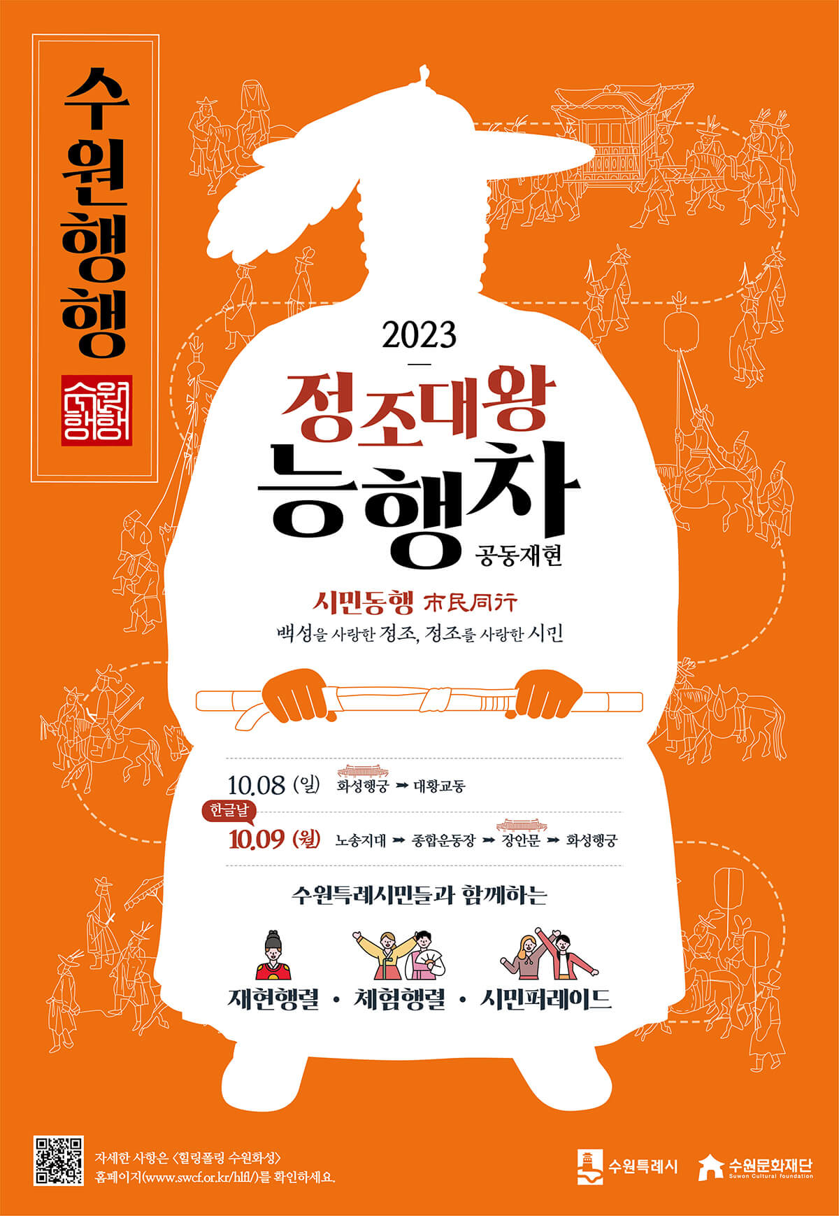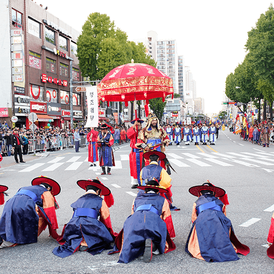 1795년 8일간 이루어진 정조의 능행차를 재현해 내는 퍼레이드로 서울 창덕궁을 출발해 수원 화성을 거쳐 융릉까지 이어지는 행렬을 만날 수 있습니다. 시민 참여 행사지만 참관만으로도 기억에 남을 경험이 될 것입니다.
