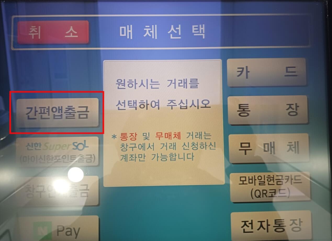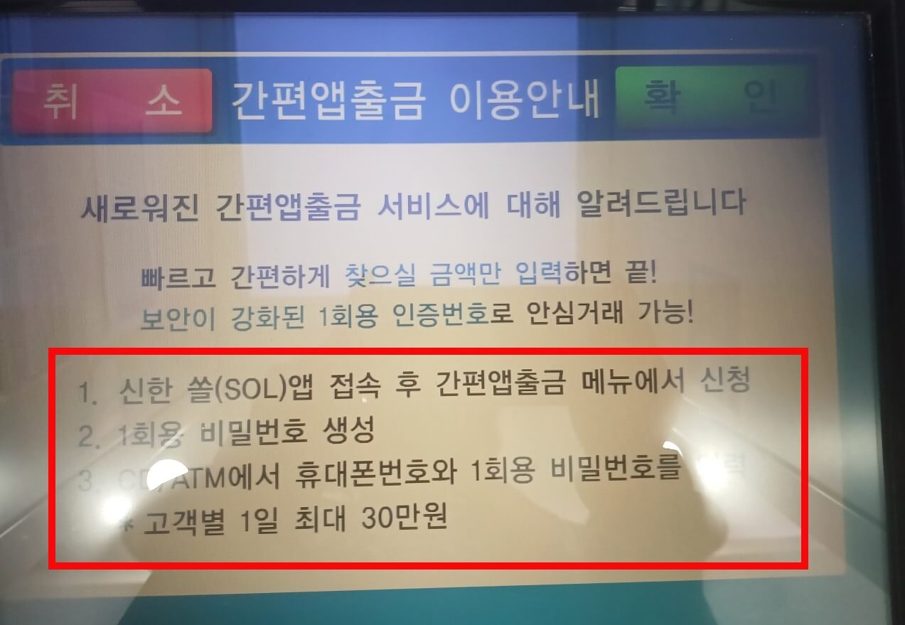 간편앱출금을 이용하려면 신한은행 어플인 SOL Bank를 사용하고 있어야 합니다. 또한 타행이나 현의점의 현금인출기가 아닌 신한은행 전용 ATM기를 이용하셔야 합니다.