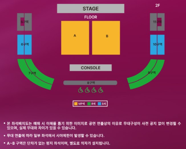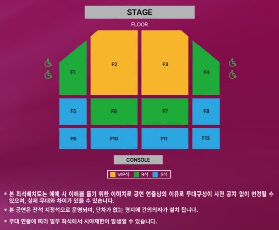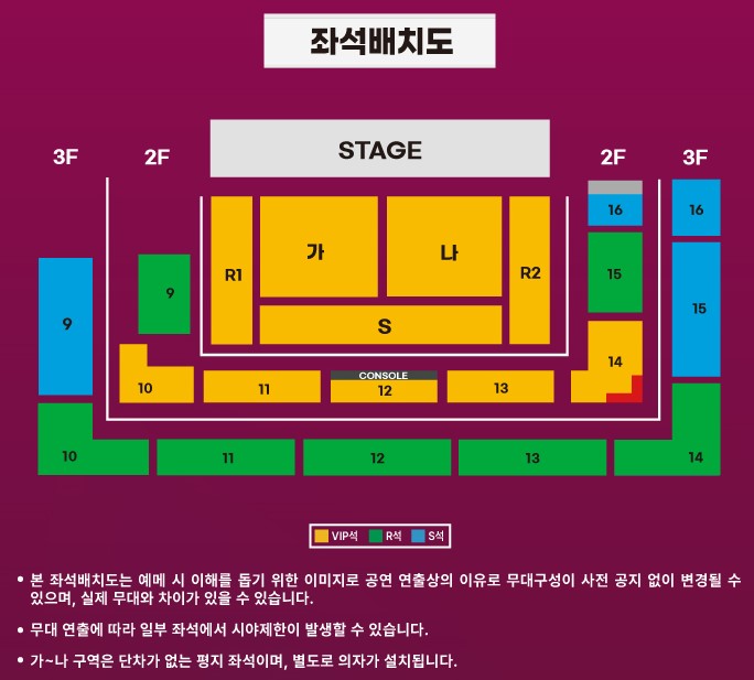 예매하실 때는 각 공연장의 좌석 배치도를 참고하세요. 다만 공연 연출을 위해 사전공지 없이 변경될 수 있으며, 단차 없이 별도로 의자가 설치되는 지역도 있습니다.