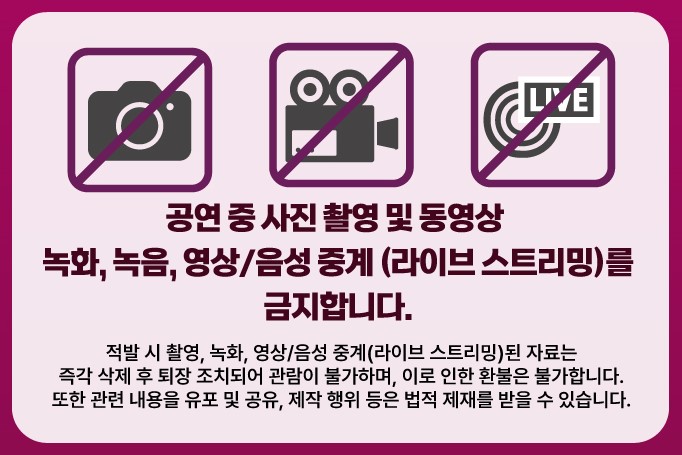 ● 공연은 사진촬영, 동영상, 녹음, SNS를 통한 생중계 등은 금지됩니다.
