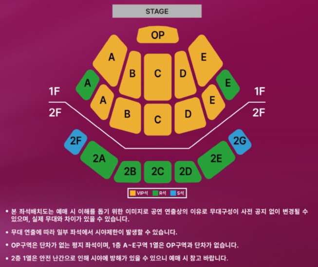 OP구역은 단차가 없는 평지좌석이며, 1층 A~E구역 1열은 OP구역과 단차가 없습니다. 2층 1열은 안전 난간으로 시야에 방해가 있을 수 있으니 예매 시 참고 바랍니다.