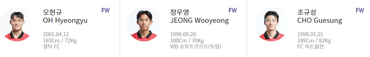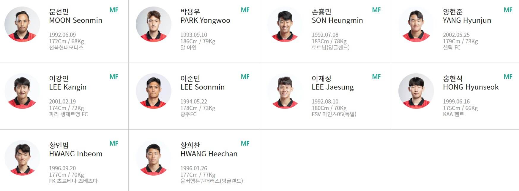 ● MF : 문선민, 박용우, 손흥민, 양현준, 이강인, 이순민, 이재성, 홍현석, 황인범, 황희찬