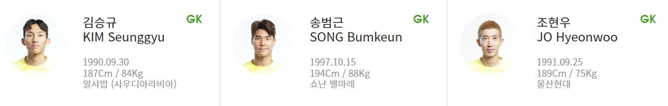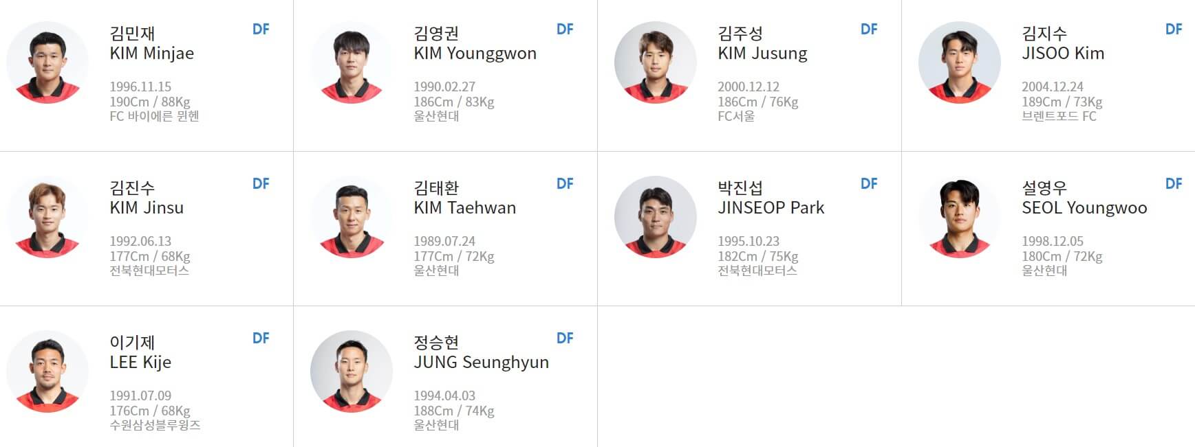 ● DF : 김민재, 김영권, 김주성, 김지수, 김진수, 김태환, 박진섭, 설영우, 이기제, 정승현