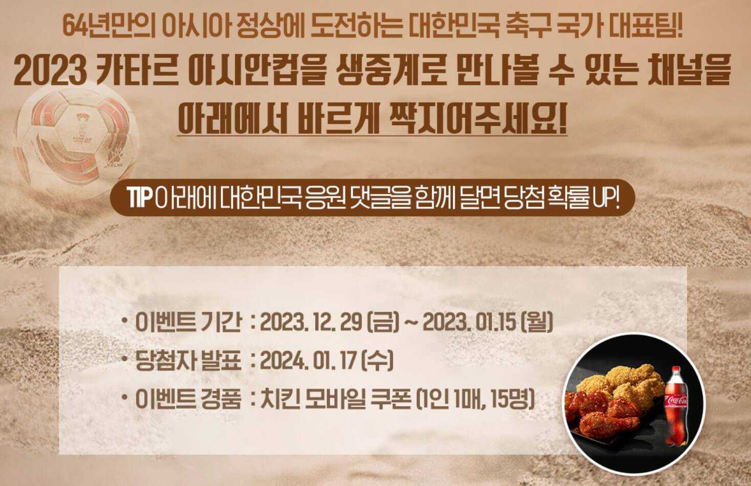 tvN SPORTS에서는 <2023 카타르 아시안컵 TV 독접 생중계 채널을 맞혀라>라는 이벤트를 진행하고 있습니다. 응원 덧글을 달아 당첨 확률을 높이시고 치킨 쿠폰에 도전해 보세요. 당첨자는 2024년 1월 17일(수)에 발표됩니다.
