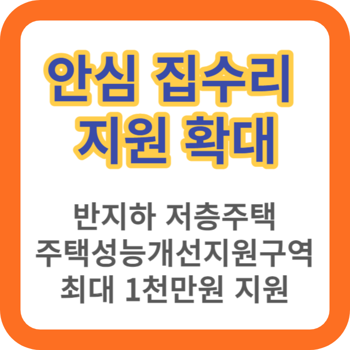 서울시가 오는 11월 30일(목)까지 <안심 집수리 보조사업>에 참여할 반지하주택, 취약가구 거주주택, 주택성능개선지원구역 내 저층 주택을 모집합니다. 상반기에는 반지하와 취약가구 거주주택에 한해 집수리를 지원했으나 하반기에 확대 적용하였으니 수리 계획이 있으시면 내용 확인하시고 지원하셔서 지원금 받으시기 바랍니다.