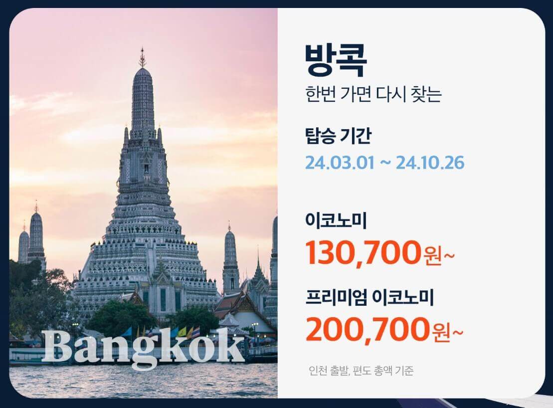 기간 동안 도쿄는 편도 90,100원부터, 방콕은 편도 130,700원부터 가능합니다. 회원을 대상으로 진행되며 홈페이지에서 직접 예약하셔야 합니다. 저렴한 항공권부터 마감이 될 확률이 높으며, 할인 적용이 불가한 날도 있으니 예매 시 참고하시기 바랍니다.