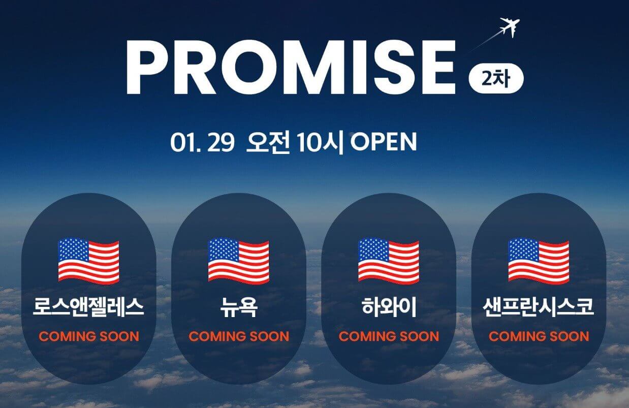 LA, 뉴욕, 하와이, 샌프란시스코 노선은 1월 29일(월) 오전 10시에 프로모션이 시작됩니다. 근래 동남아시아지역의 할인 이벤트는 많았어도 장거리는 없었는데요 유용하게 이용하실 수 있을 것 같습니다.