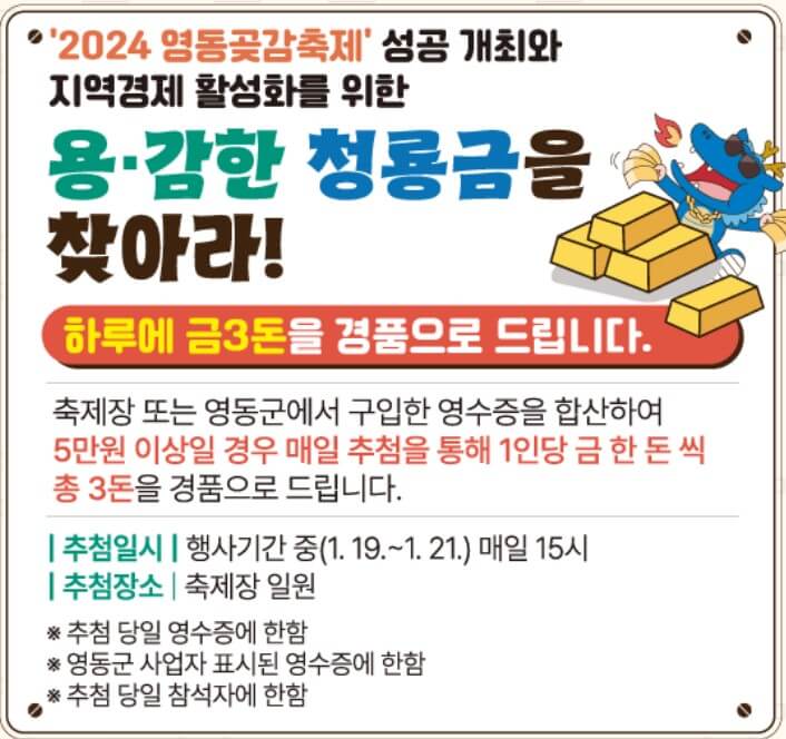 축제가 열리는 3일 동안 매일 금 3돈을 경품으로 증정하는 이벤트도 열립니다. 축제장 또는 영동군에서 구입한 영수증을 합산하여 5만 원 이상일 경우 경품권 응모가 가능합니다. 추첨을 통해 1인당 금 한돈씩 총 3분에게 매일 증정합니다.