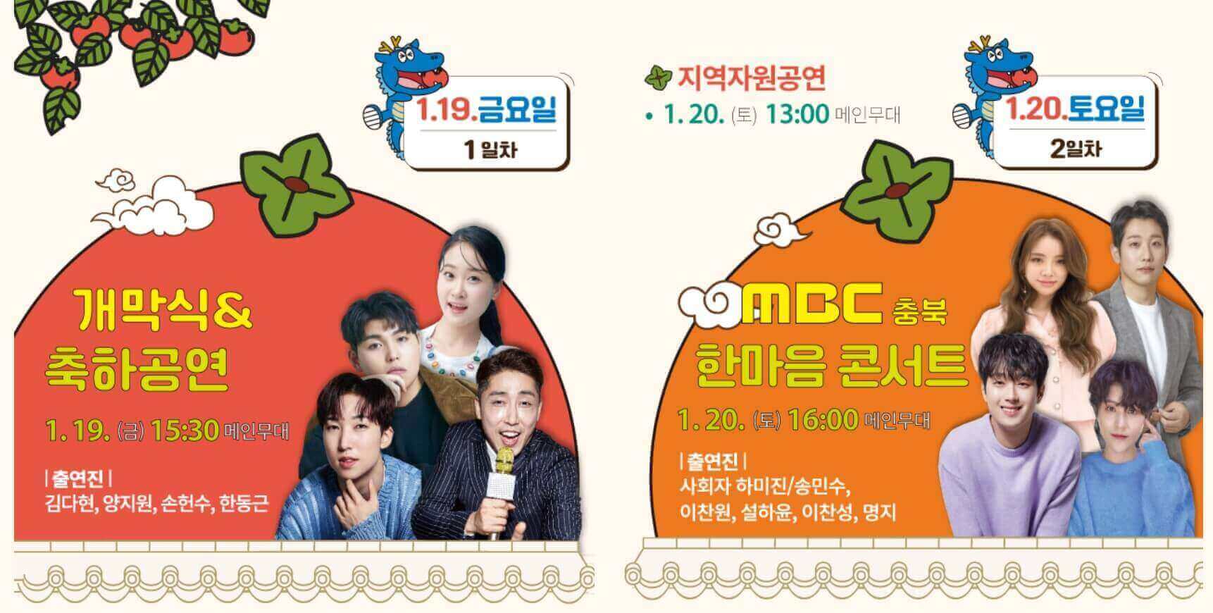 2024 영동 곶감 축제는 1월 19일(금) - 21일(일)까지 3일간 열리는데요, 개막식과 둘째 날에 초대 가수들을 볼 수 있습니다.