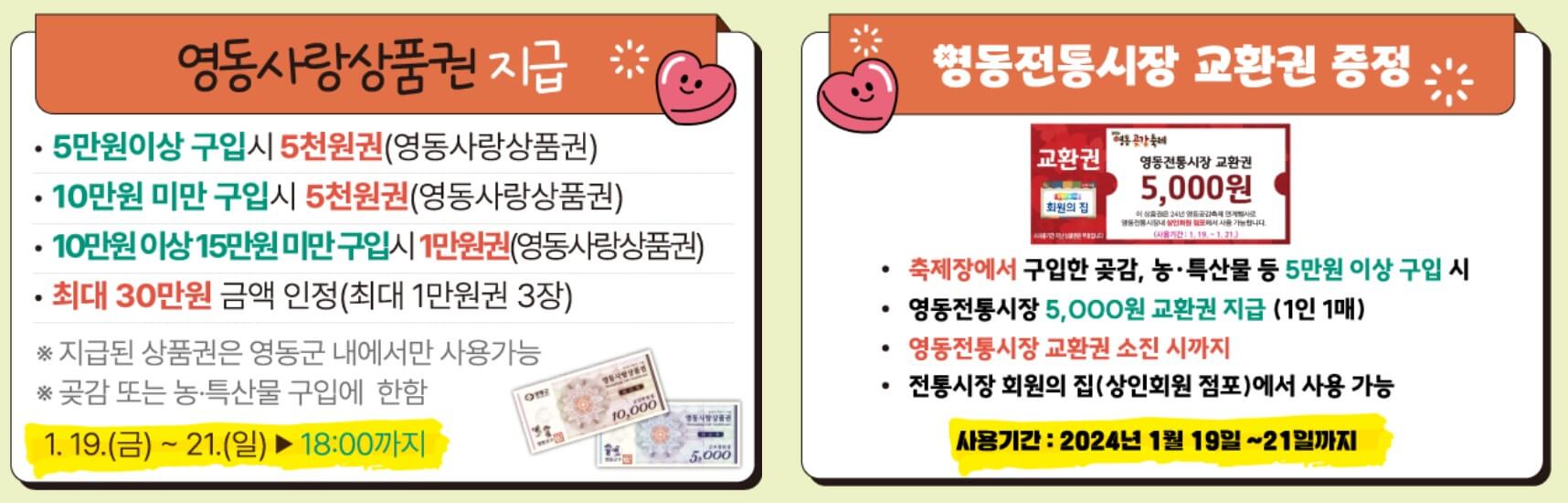 추첨에 당첨되지 않더라도 영동의 곶감이나 농산물을 5만 원 이상 구입 시에는 영동사랑 상품권 5천 원권, 10만 원 이상 구입 시 1만 원권을 증정합니다. 지급된 상품권은 영동군 내에서 사용하실 수 있어요.