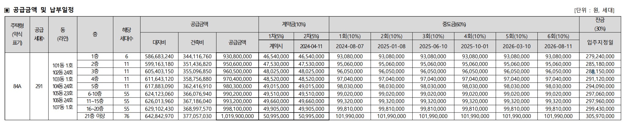 전 세대 면적은 동일하지만 타입과 층수에 따라 약간씩 다른 가격을 형성하고 있습니다.